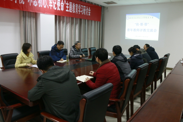 1123日下午,我院在学院会议室开展“传··带”青年教师评教活动。院党总支书记周建新、学院教学督导和部分青年教师参加活动,活动邀请院关工委副主任刁国旺教授参加。