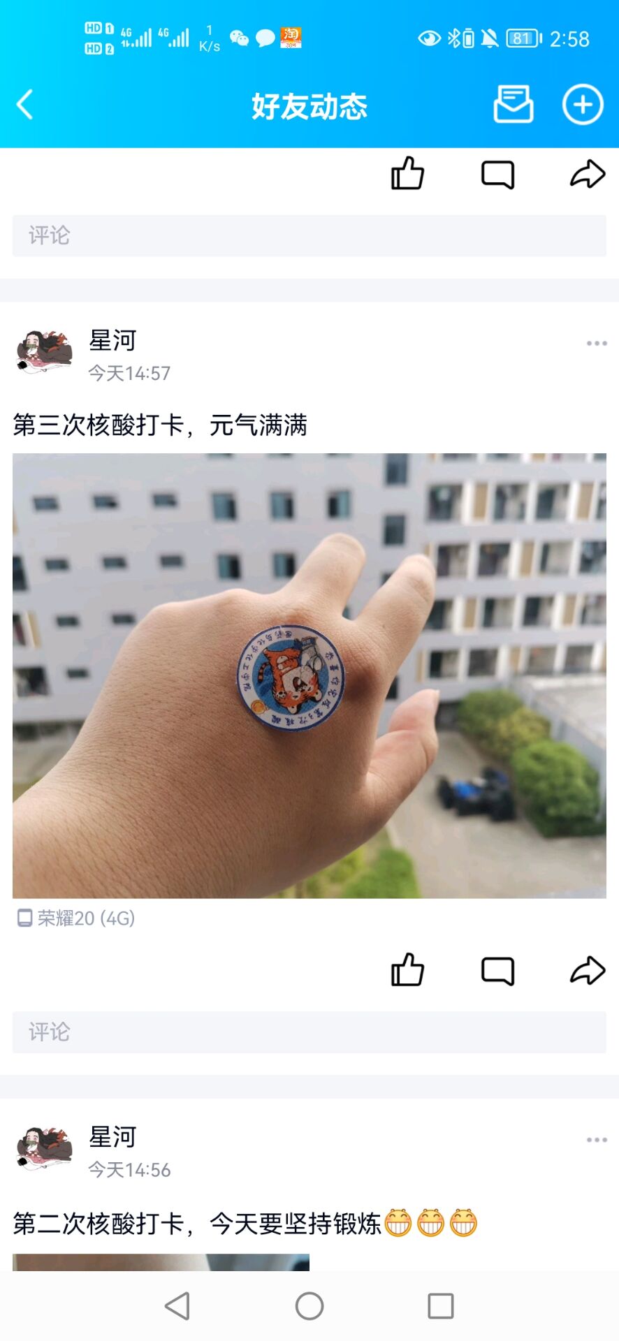 打卡活动一经推出,得到了同学们的欢迎,萌萌的贴纸为同学们的课余生活增添了可爱的色彩,也提高了同学们配合参加核酸检测的自觉性。
