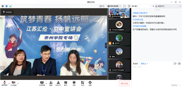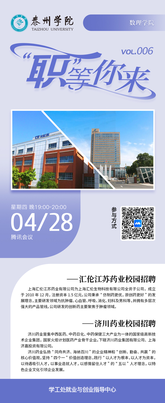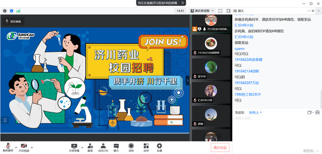 为更好指导学生就业,拓宽学生就业渠道,我院于4月28日举办“‘职’等你来”校园专场线上招聘会,本次招聘会邀请汇伦江苏药业和济川药业两家药企参加,我院18级、19级学生在线上参与。