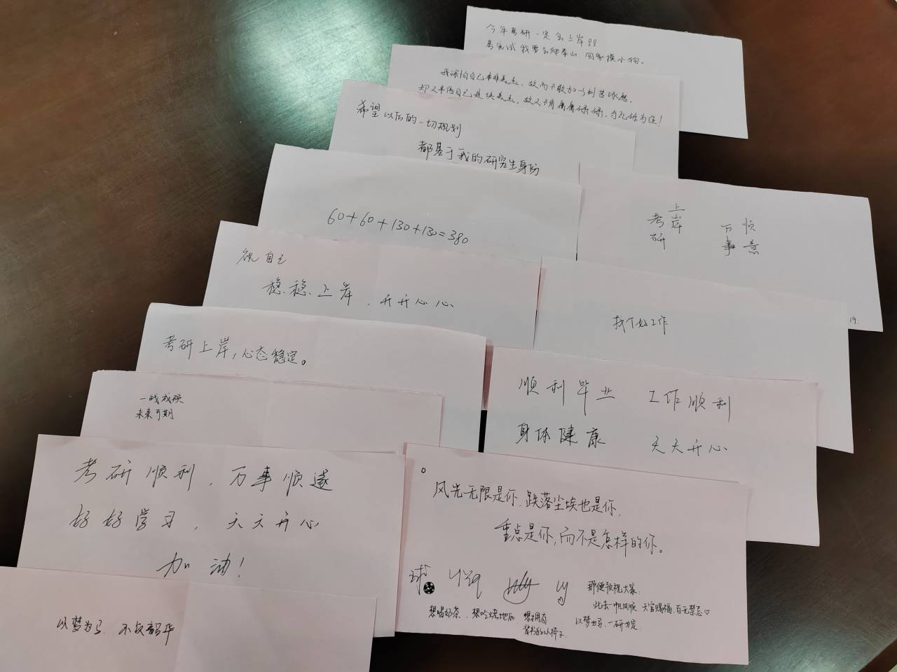 讲座上,李存福结合自身经历与学生实际,分别从考研与就业两个方面入手,分析压力来源、提出应对策略,鼓励同学们要以积极的心态去面对挑战,坚定目标,不懈努力,坚持奋斗。讲座结束后,同学们积极与李存福老师交流感想,并留下自己手写的心愿卡片。