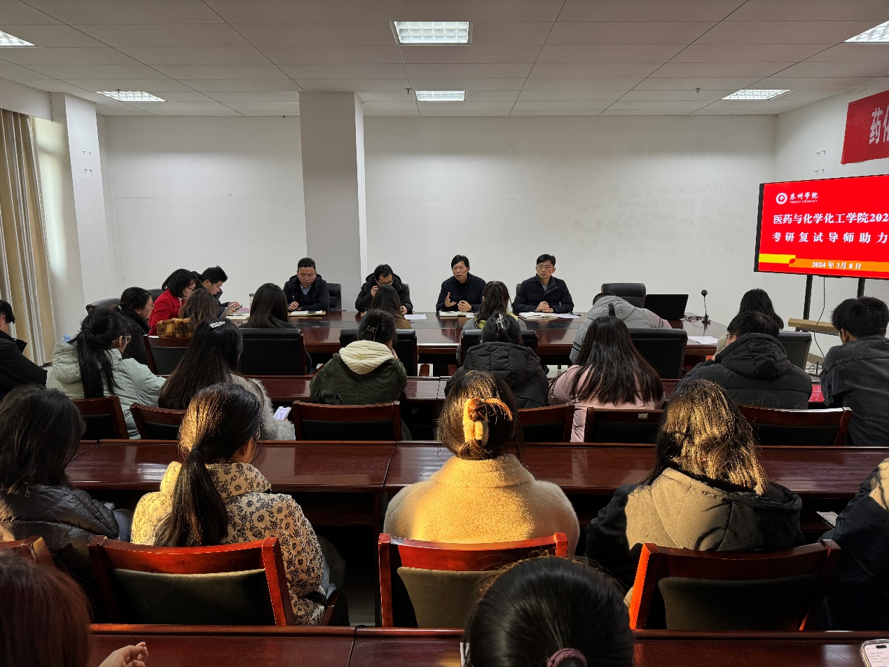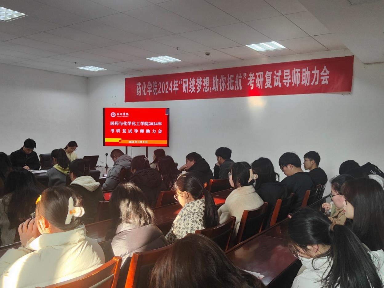 为扎实做好2024届考研学生的复试调剂指导和服务工作,提高学生考研复试成功率,38日下午,医药与化学化工学院延续“研续梦想,助你抵航”主题,在行政楼D2201会议室召开了2024年考研复试导师助力会。学院领导班子成员、助研导师代表、毕业班班主任、辅导员以及考研初步过线学生参加了本次活动。