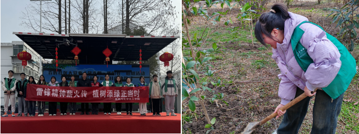 上午的活动现场设置了环保知识宣传舞台,同学们通过说唱、舞蹈等形式向小区居民普及环保知识,提高大家的环保意识。随后同学们在社区工作人员的指导下,拿起铁锹、水桶等植树工具,投入到社区植树活动中,共种下了桂花树苗木40余棵。挖坑、扶苗、培土到浇水,大家热情高涨,既感受到了劳动快乐,又发扬了服务人民、助人为乐的雷锋精神。