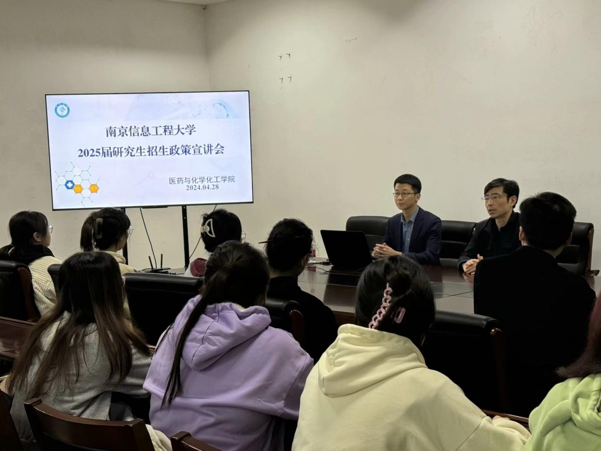 宣讲会上,邵高峰介绍了南京信息工程大学以及化学与材料学院的基本情况,着重讲解学科专业发展历程、师资科研团队、代表性科研项目成果以及人才培养质量情况;结合南京信息工程大学2025届研究生招生专业和人数,为现场学生给出报考建议。宣讲会后,邵高峰博士就考研目标专业选择、备考努力方向等方面与学生进行了个别交流。