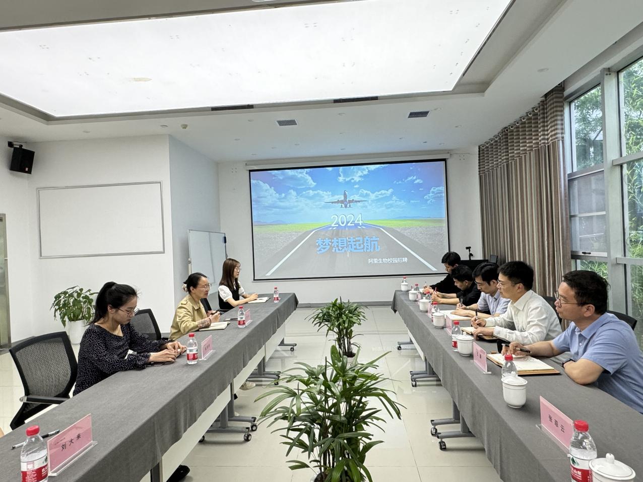 在阿里生物技术泰州有限公司,企业首先从公司简介、发展平台、人才需求、薪资福利等方面作了招聘宣讲。接着校企双方针对企业目前的人才需求情况进行了深入交流,双方就增加学生实习岗位、就业岗位,实验室共建等事项上达成共识。随后的面试环节,2名学生达成就业意向。交流结束后,朱诚还看望了在企业工作的校友,关心他们的工作生活情况,欢迎他们常回母校看看。