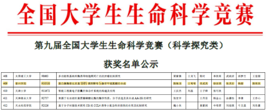 经过专家评审,学院陈海龙和王弯弯老师指导的参赛作品“蛋白激酶催化亚基SNF1调控酵母S-腺苷甲硫氨酸的合成”荣获国赛二等奖。