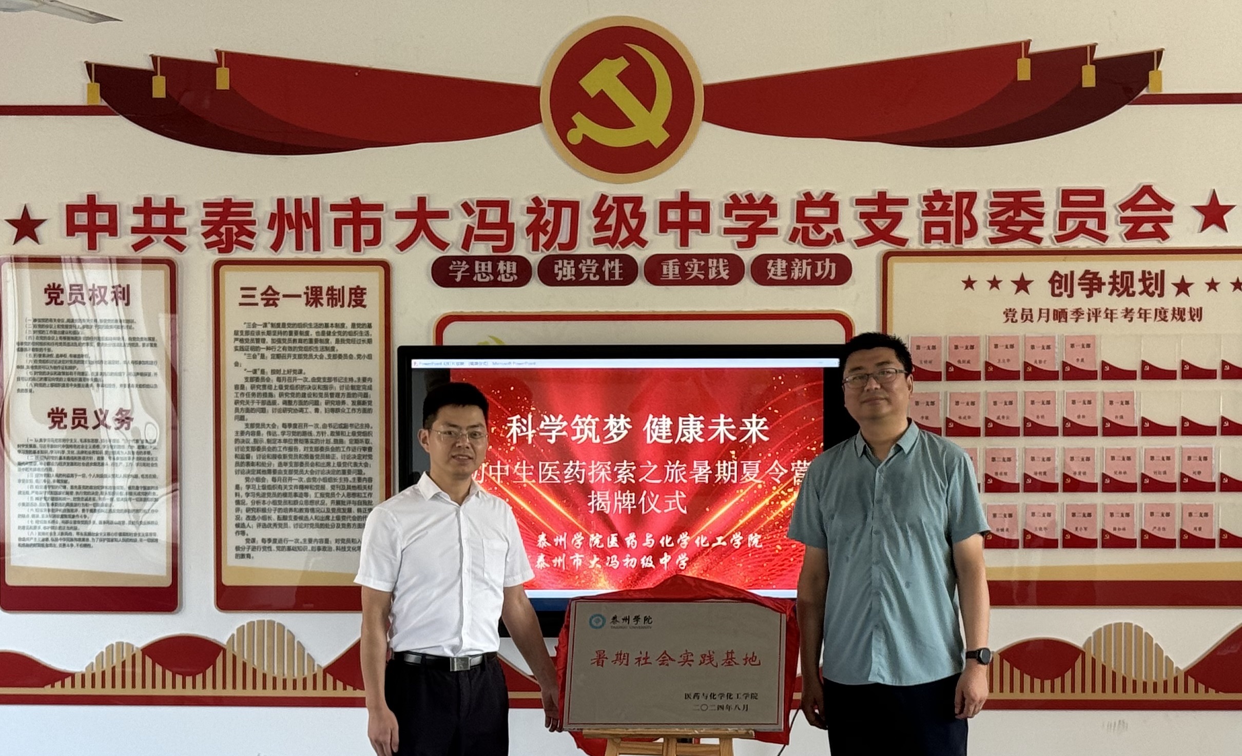 8月19日,医药与化学化工学院联合泰州市大冯初级中学举办“科学筑梦 健康未来”暑期科技夏令营,医药与化学化工学院党总支书记朱诚、党总支副书记张红祥、大冯初级中学校长邓小卿、副校长钱剑威、陆成鹏等出席活动。朱诚、邓小卿共同为“太阳集团tcy8722暑期社会实践基地”揭牌。