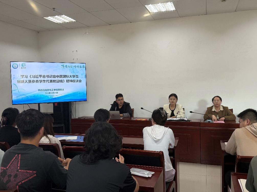为深入学习领会《习近平总书记给中国国际大学生创新大赛参赛学生代表的回信》精神,激励青年大学生投身创新实践、勇担时代使命的信心和决心,10月18日,医药与化学化工学院在D2201会议室召开师生专题座谈会,学习习近平总书记回信精神。学院团总支书记高菲晨、新引进青年博士陈政、辅导员以及学生代表参加活动。