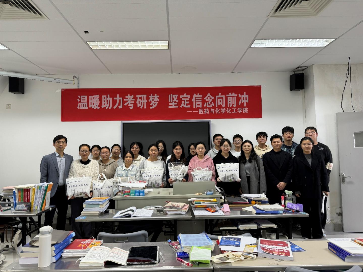 张红祥询问大家近期的学习生活状态,对同学们认真备考的“精气神”进行了充分肯定,他勉励同学们坚守初心,调整好心态,保持一颗平常心和恒心,绝不放弃,尽全力冲刺。老师们一起向备考学生发放考研加油礼包,温暖的毛毯、贴心的文具、上岸帆布包等,每一份慰问品都饱含着学院对考研学子的殷切关怀和深深祝福。同学们纷纷表示,老师的关心给了自己更大的勇气和毅力,大家会更专心备考,21制药工程2班学生汪思说:“学院组织的系列考研慰问,老师们很用心,我们很暖心,在漫漫考研征途中,同学们都在奋力奔跑,我并不孤单。”