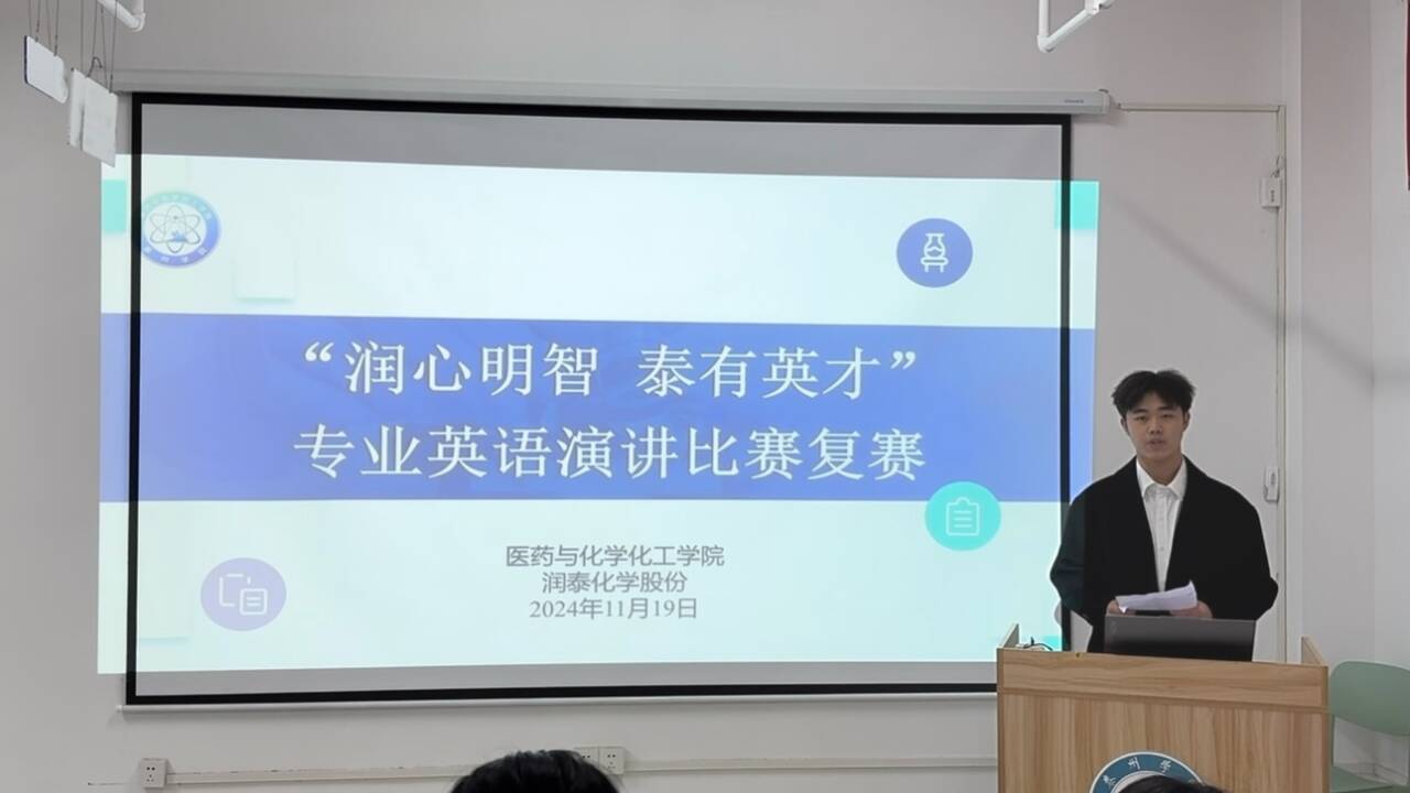 为加强学院学风建设,增强学生专业英语学习积极性,提升校企合作实效,11月19日,医药与化学化工学院与润泰化学有限公司合作,在一站式学生社区举办“润心明智,泰有英才”——首届“润泰杯”专业英语演讲比赛。比赛邀请外国语学院、药化学院专任教师担任评委,学院辅导员、学生代表参加活动。