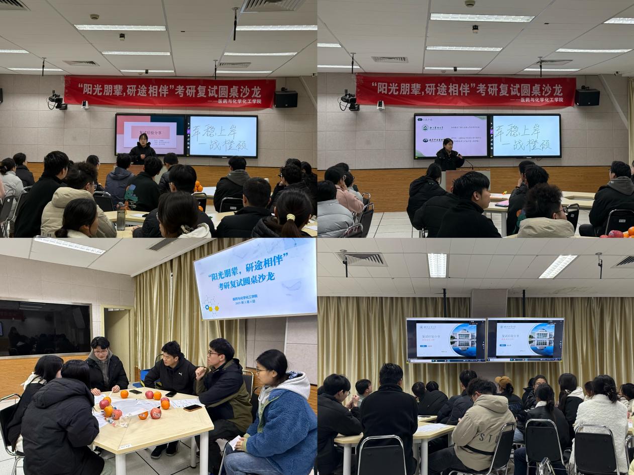 为切实助力2025届考研学生提升复试竞争力,以朋辈力量赋能研途,3月4日下午,医药与化学化工学院在B3407智慧教室举办“阳光朋辈,研途相伴”考研复试圆桌沙龙。学院党总支书记朱诚、党总支副书记张红祥、学工办主任、就业辅导员、2025届考研达线学生参加活动。