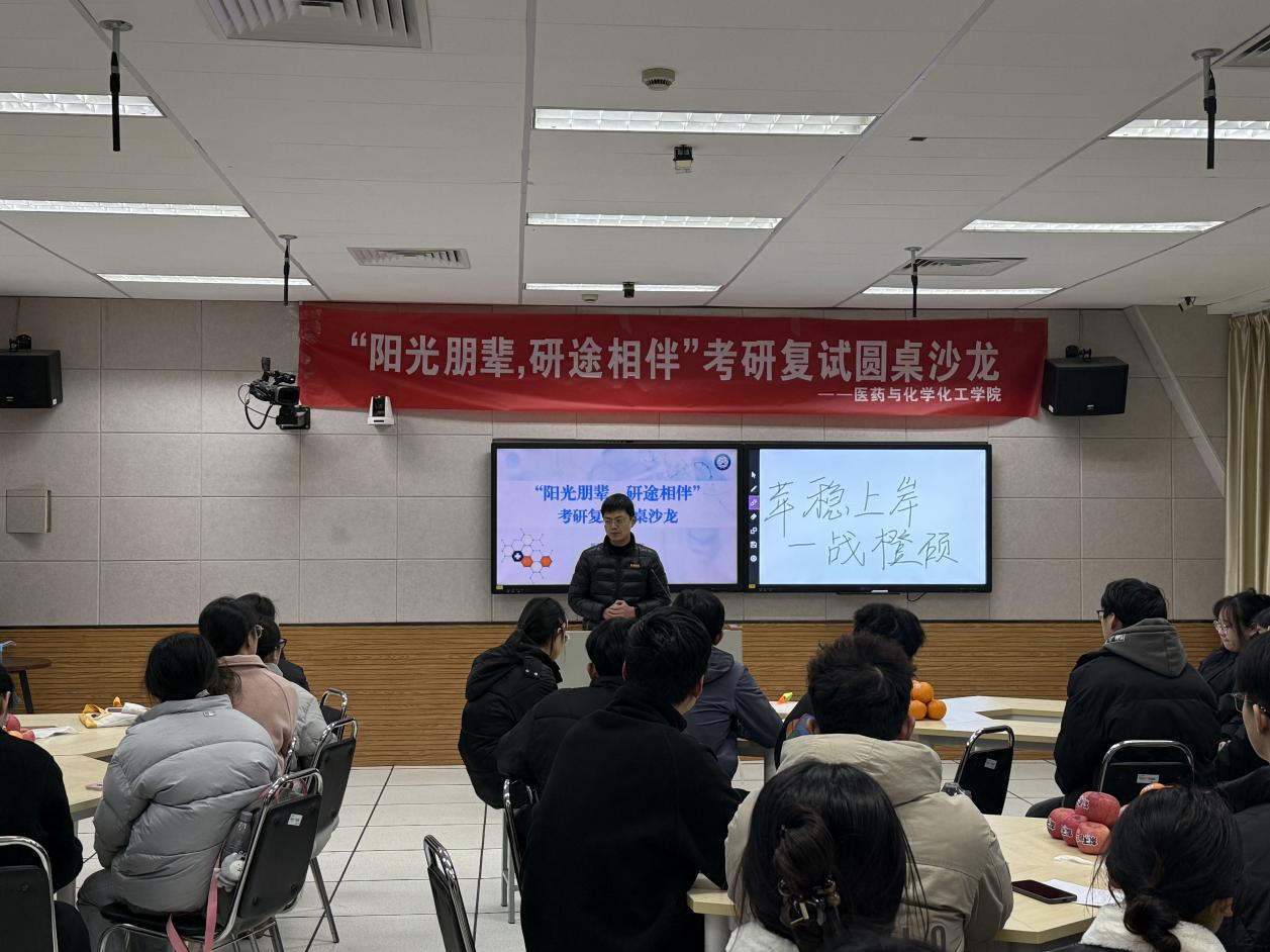 为切实助力2025届考研学生提升复试竞争力,以朋辈力量赋能研途,34日下午,医药与化学化工学院在B3407智慧教室举办“阳光朋辈,研途相伴”考研复试圆桌沙龙。学院党总支书记朱诚、党总支副书记张红祥、学工办主任、就业辅导员、2025届考研达线学生参加活动。