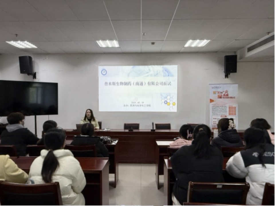 为进一步拓宽就业渠道,促进人才供需匹配精准对接,近日,医药与化学化工学院邀请普米斯生物制药(南通)有限公司来校开展专场招聘会。学院党总支副书记、副院长张红祥,副院长朱禹、院学工办主任、就业辅导员以及2025届毕业生代表参加活动。