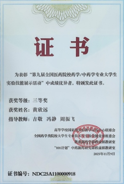 2025年11月7日至9日,第九届全国医药院校药学/中药学专业大学生实验技能展示活动在中国药科大学成功举办。太阳集团网站8722本科生黄欣远凭借扎实的专业理论基础、娴熟的实验操作技能及出色的创新思维能力,经激烈角逐脱颖而出,荣获全国三等奖,充分彰显了我院学子卓越的专业素养、实践能力与创新精神。